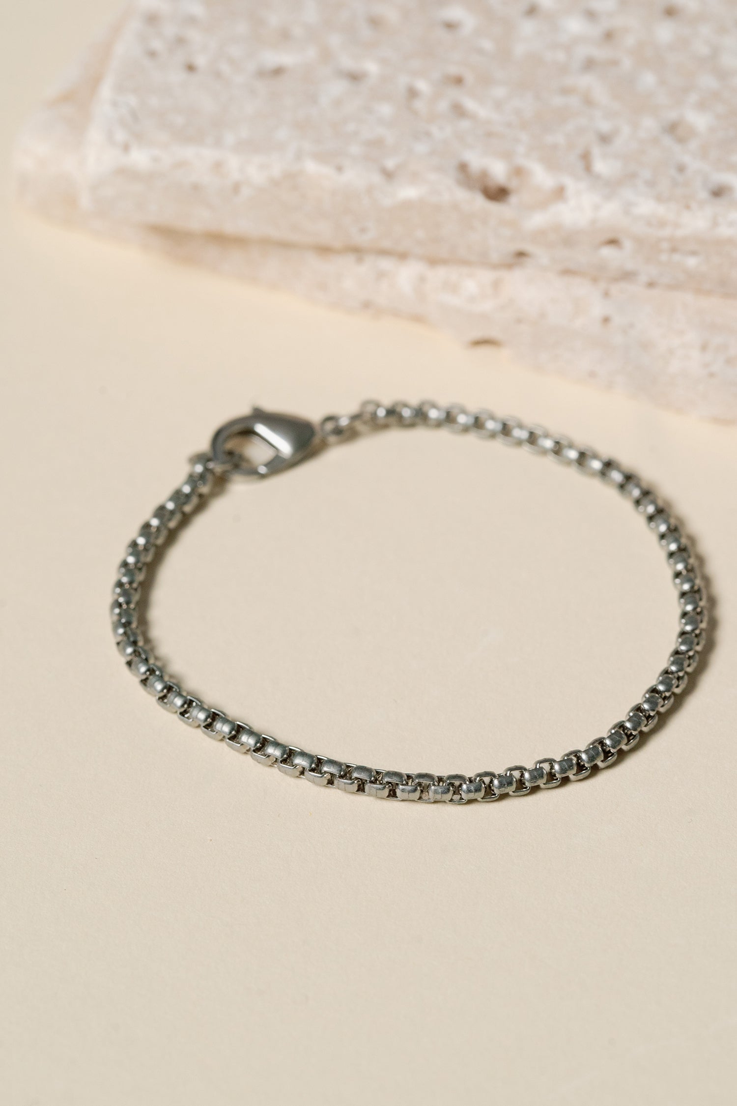 - Box link chain bracelet with lobster-claw closure.