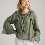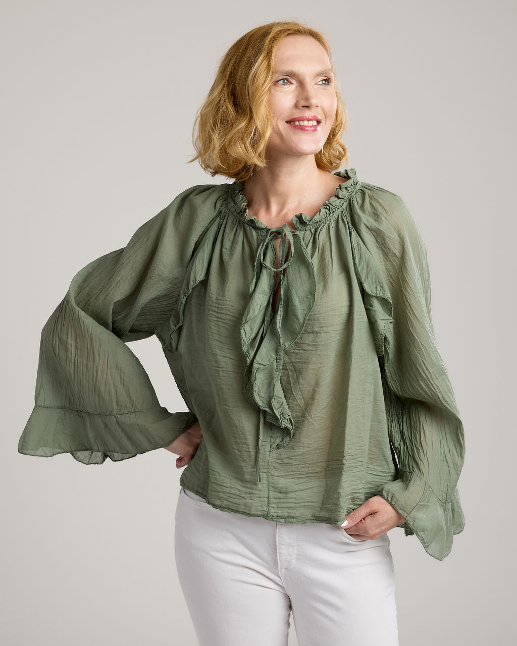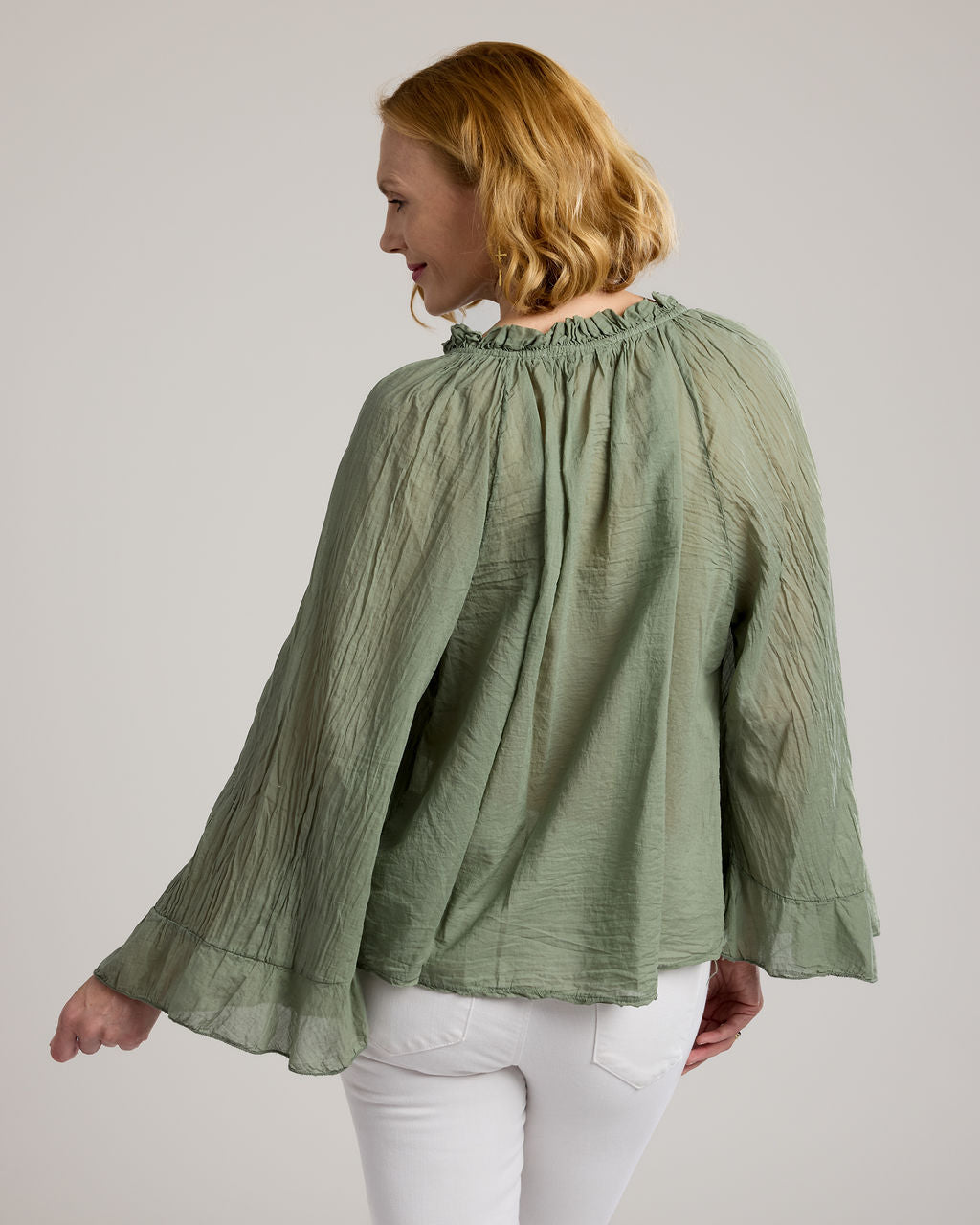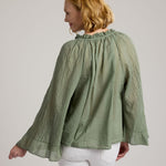 • Romantic and refined, the Gloria Blouse channels timeless Edwardian charm with a modern ease. Crafted from crisp, breathable cotton, it features a softly blousy silhouette with billowing long sleeves that gather gently at the wrist. Feminine details like delicate pleating, a subtle neckline, and graceful drape make it an effortless piece to dress up or down
