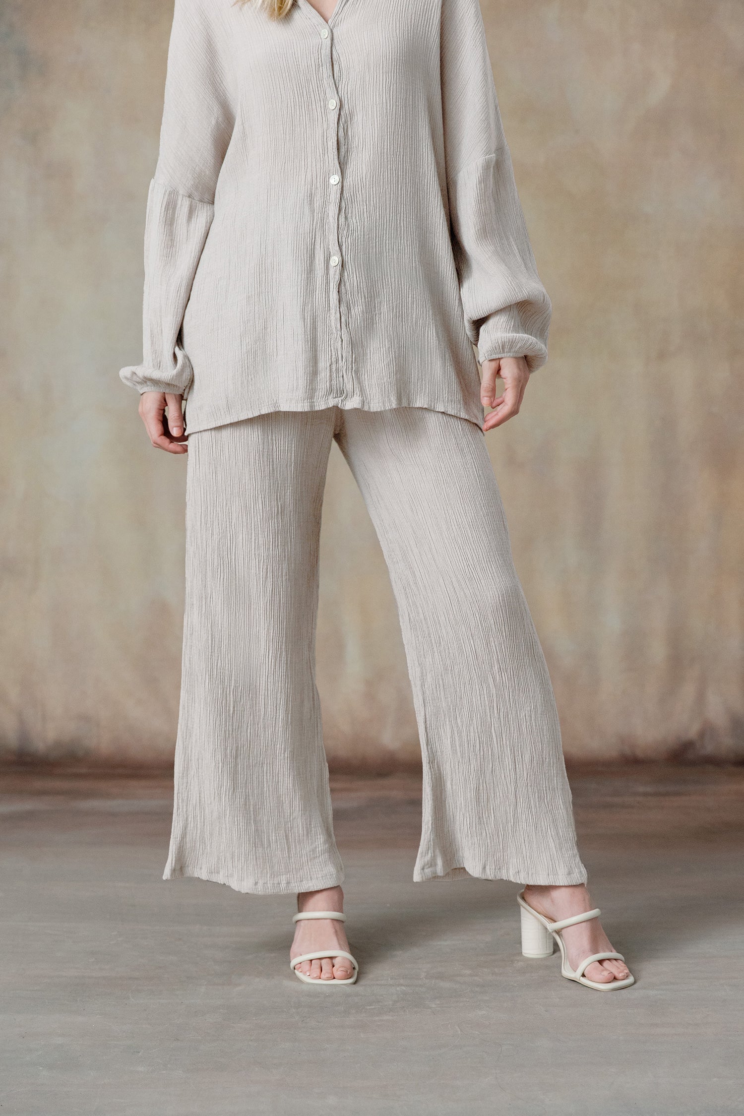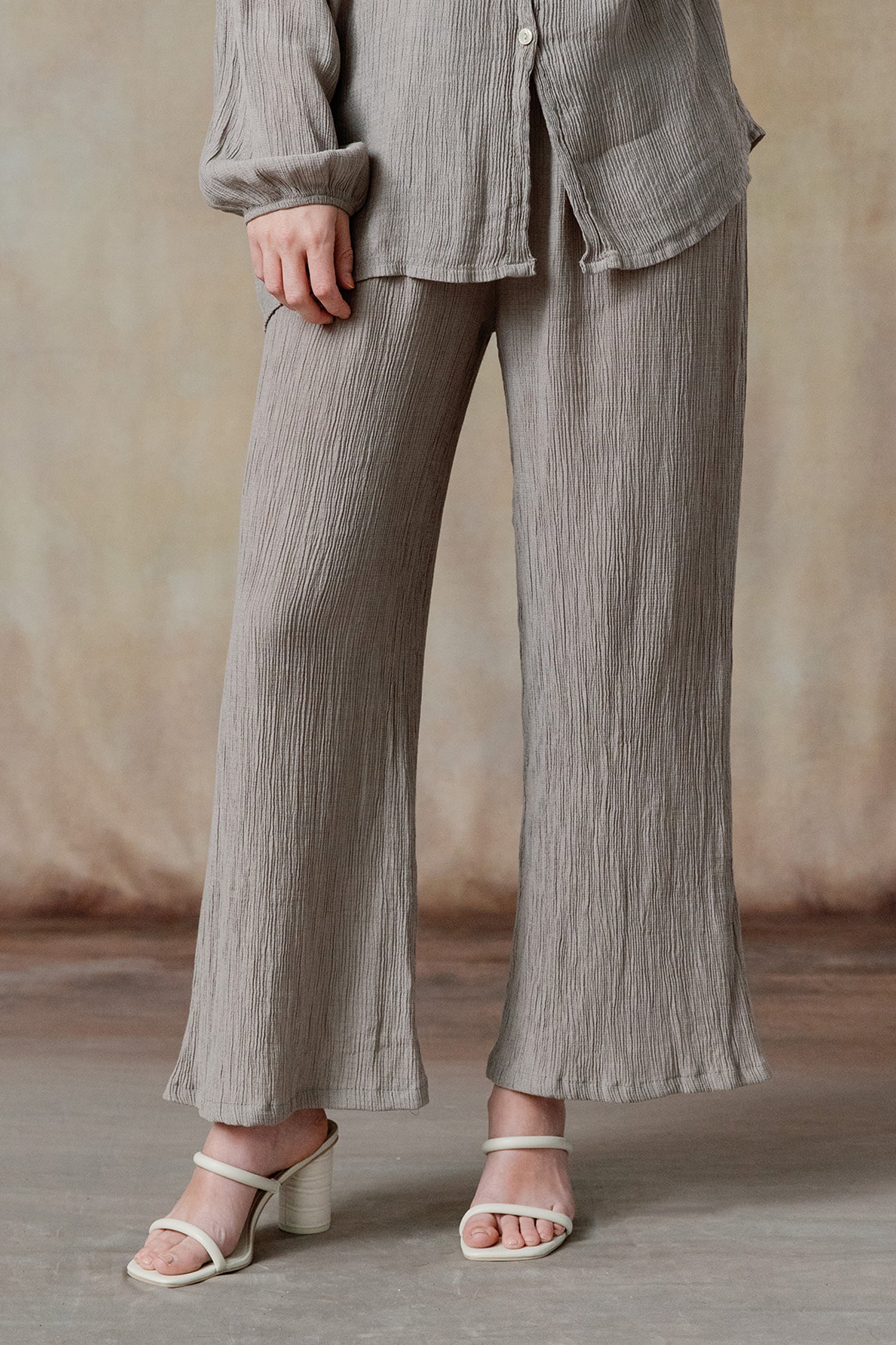 - Full-length wide-leg pants, elastic waistband.