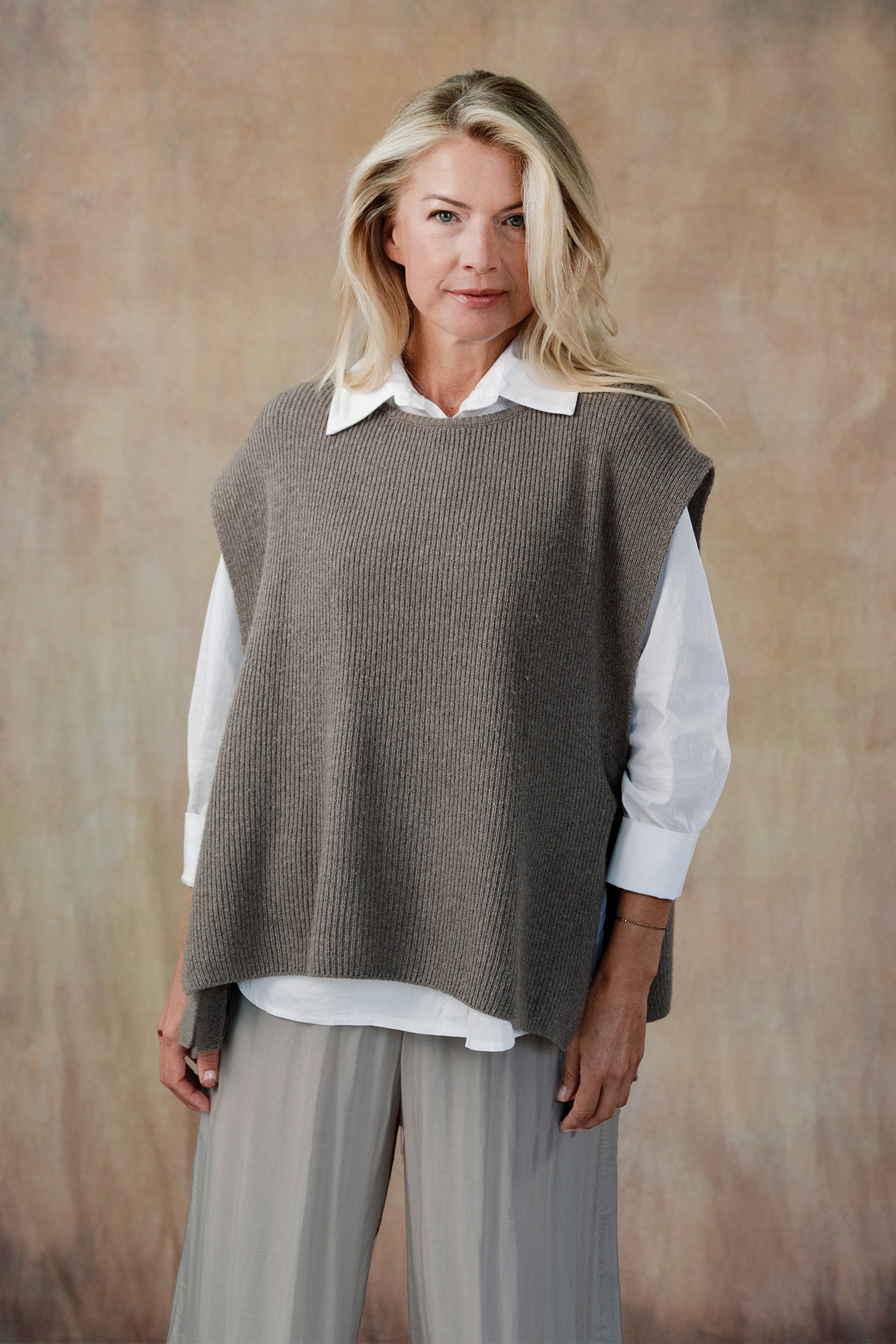 • Boat neck, sleeveless open-side vest with self ties at sides.