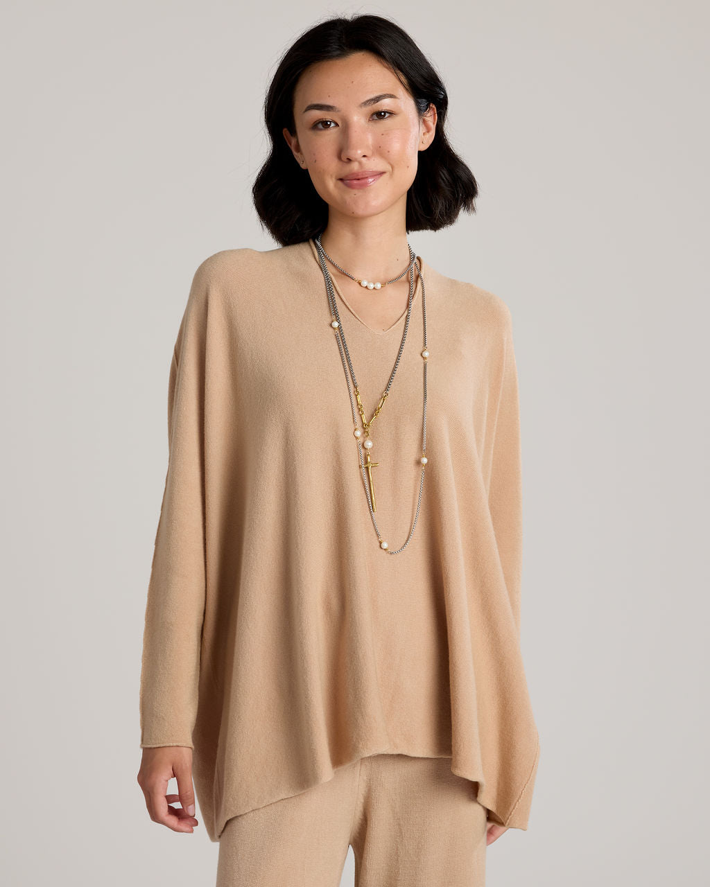 Indulge in cozy elegance with our Claudia V-Neck Sweater, crafted from irresistibly soft knit fabric that feels like a dream. This fan-favorite piece features a flattering neckline and high-low hem, creating a drapey silhouette that pairs beautifully with our Cleo Sweater Pants. Part of our Mix-and-Match Knitwear capsule.