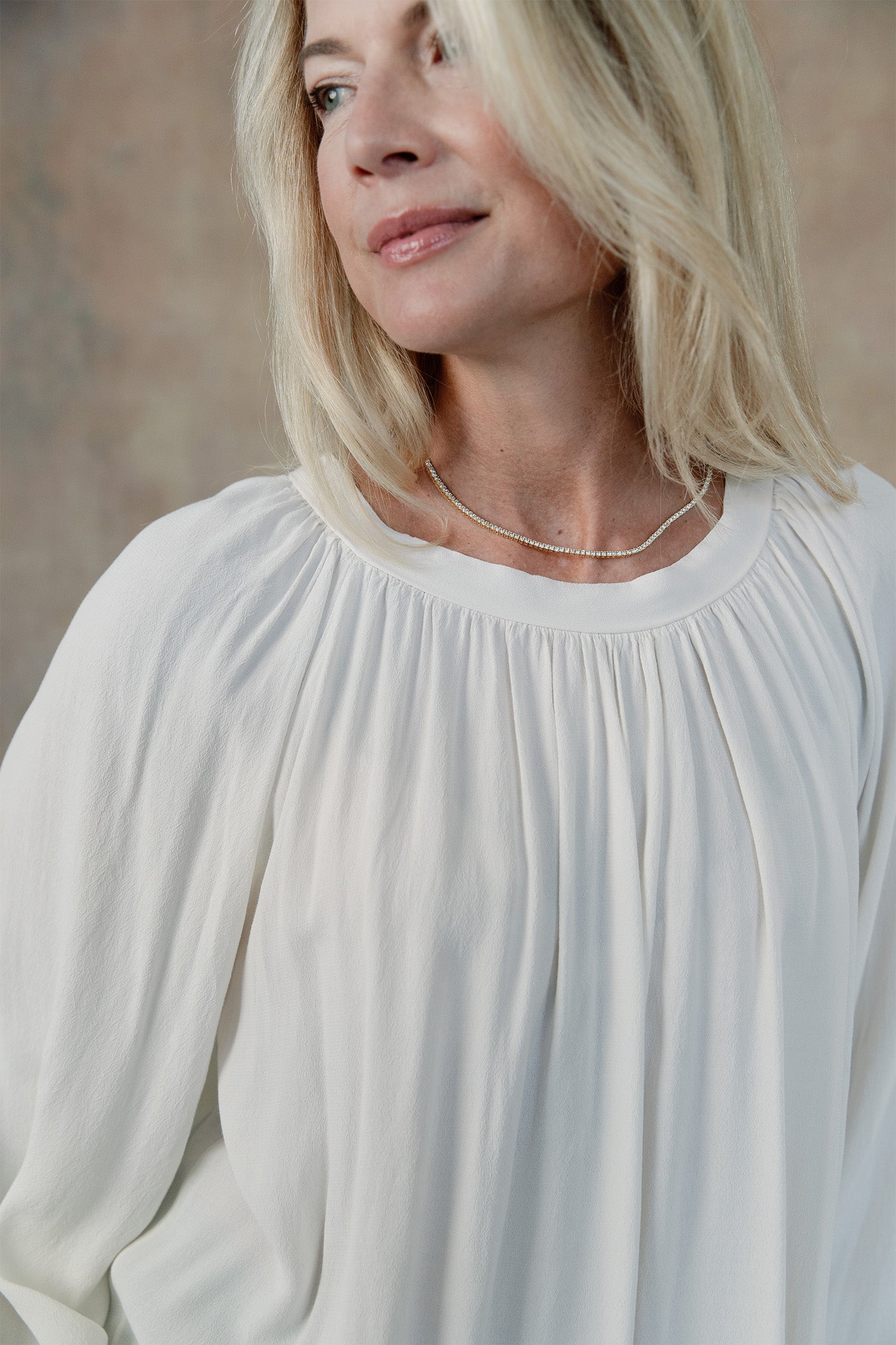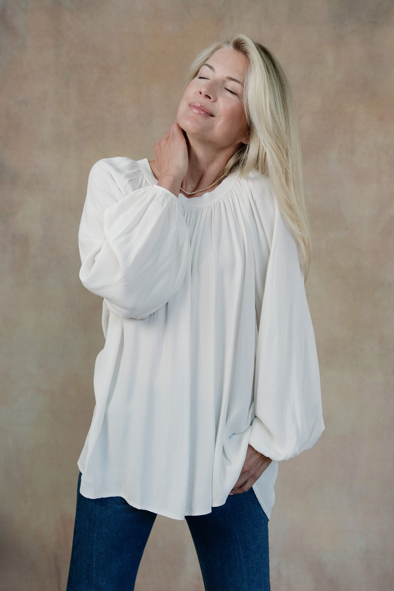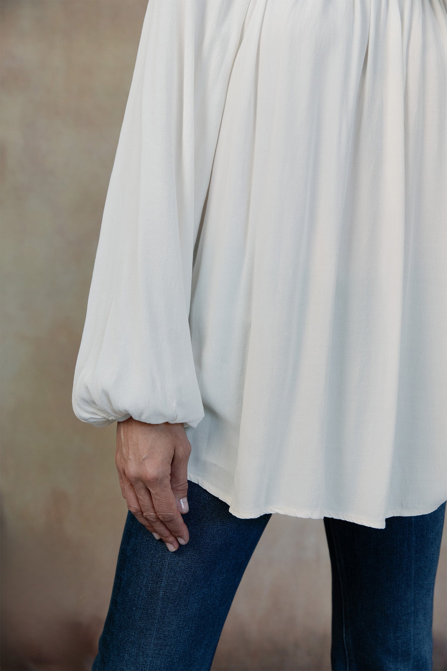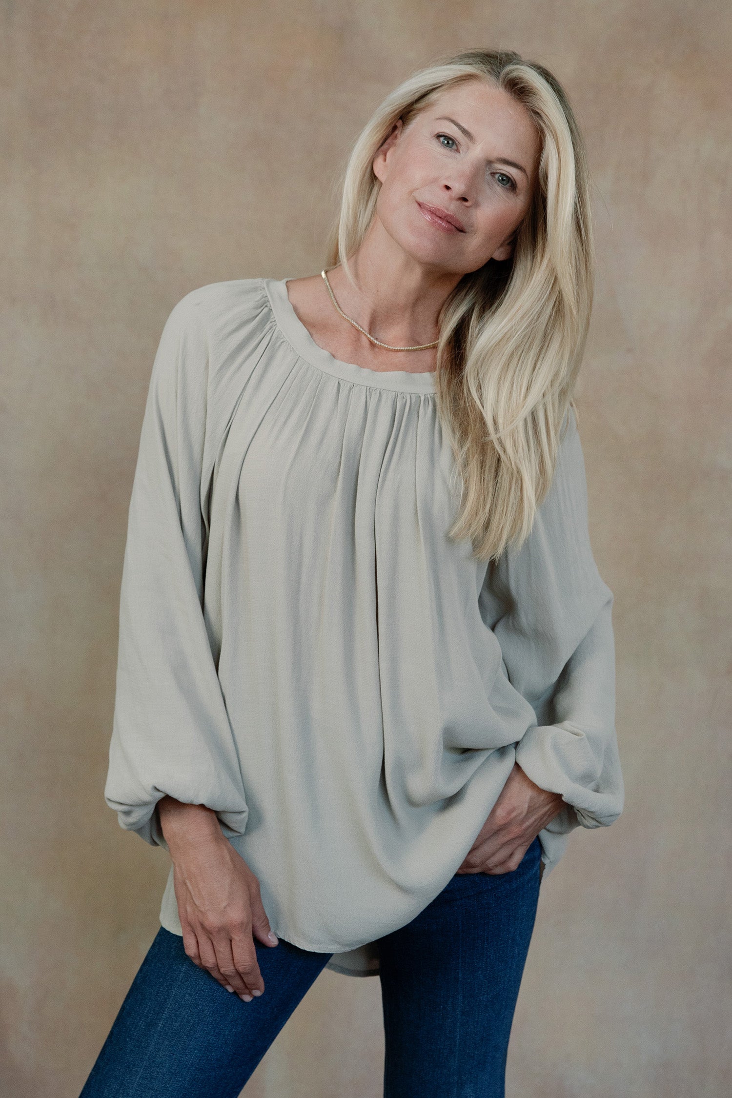 - Boatneck with gathering, long sleeves with elastic cuffs, tunic length.
