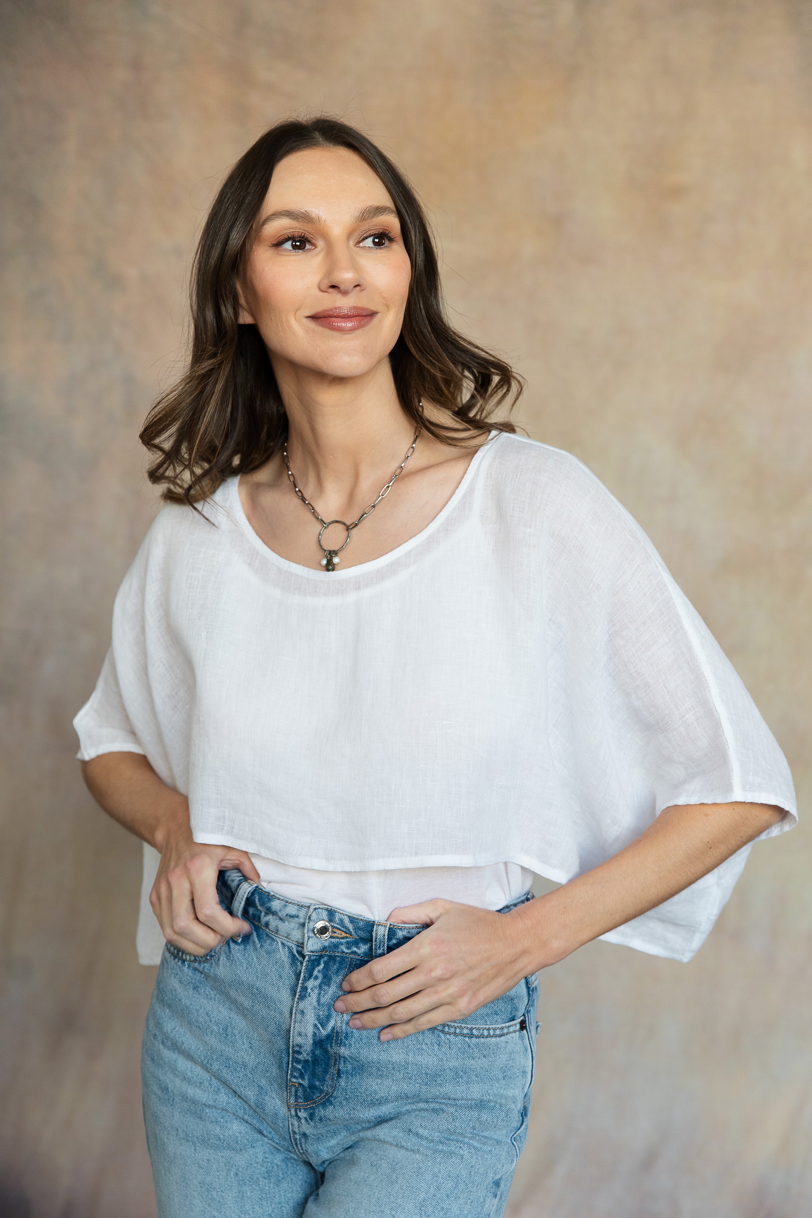 A light layer inspired by sun-drenched afternoons, the Lana Linen Topper is the perfect finishing touch. With its cropped silhouette and flowing dolman sleeves, this breezy piece is designed to complement camisoles and dresses alike. Layer it over the Marina Silk Dress for a delicate balance of texture or style it with the Lenore Linen Pants for a coordinated look. Part of our mix-and-match Italian Linen assortment.