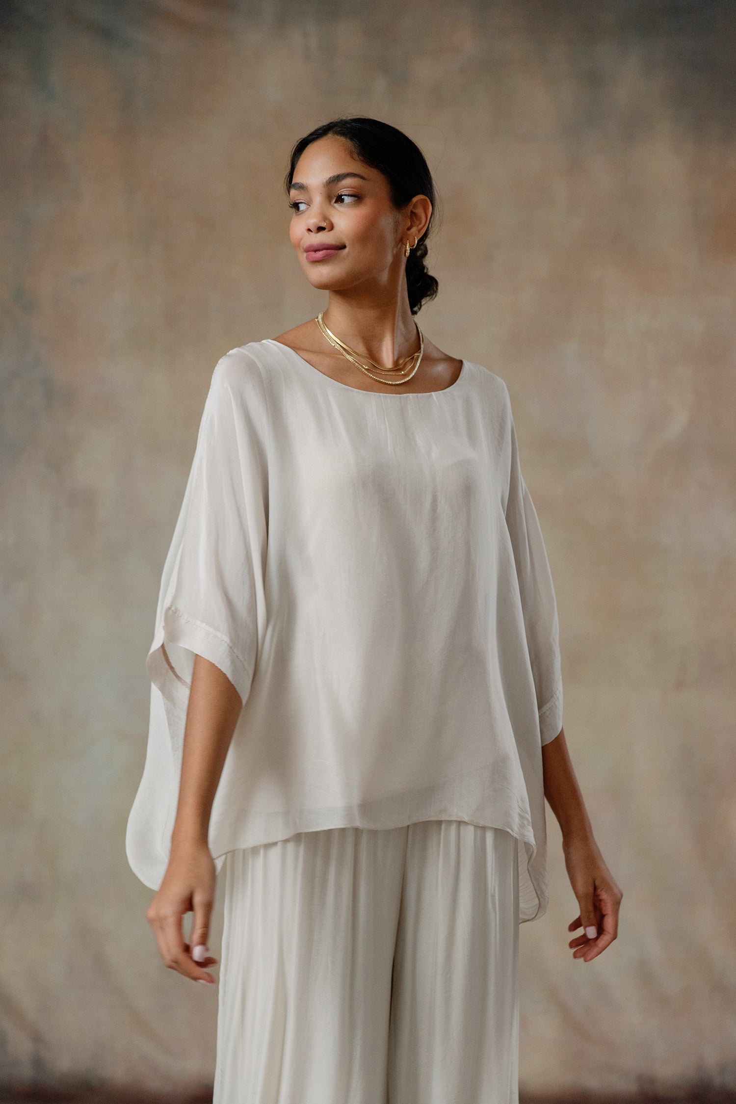 Our Martina Silk Top is an ode to grace. This stunning piece features delicate silk layers that cascade beautifully, complemented by an eye-catching asymmetrical hemline. Perfectly paired with jeans or pants, it offers a breezy, feminine look that's both effortless and elegant. For a truly brilliant head-to-toe ensemble, match it with our Madelyn Silk Pants and step into a world of timeless allure. Part of our mix-and-match Italian Silk assortment.
