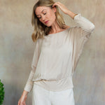 - Boat neck, three-quarter length sleeve with banded cuffs, banded hem, comfortable knit jersey lining, silk overlay.