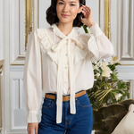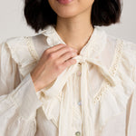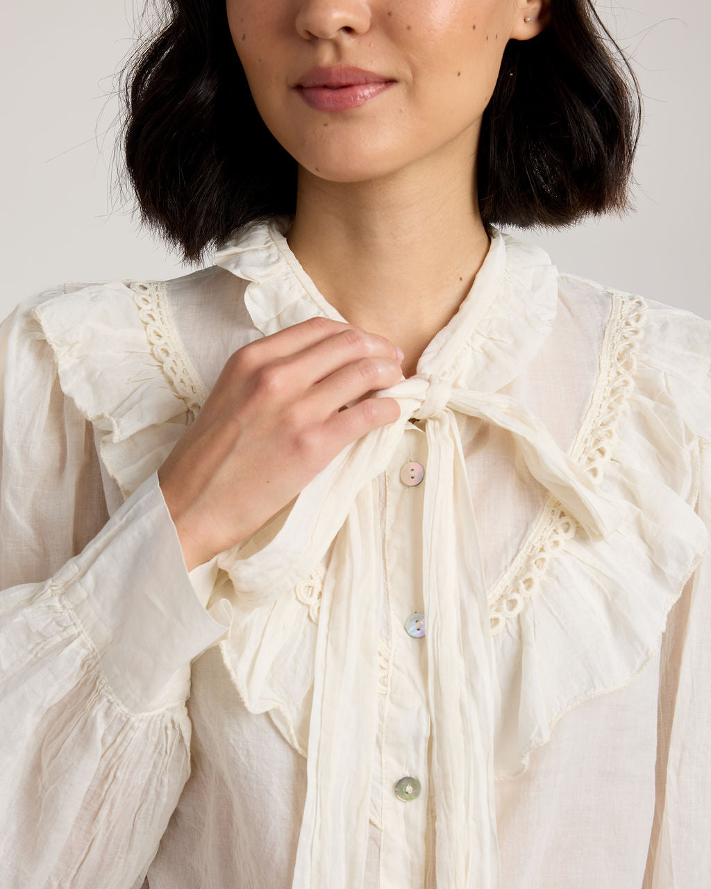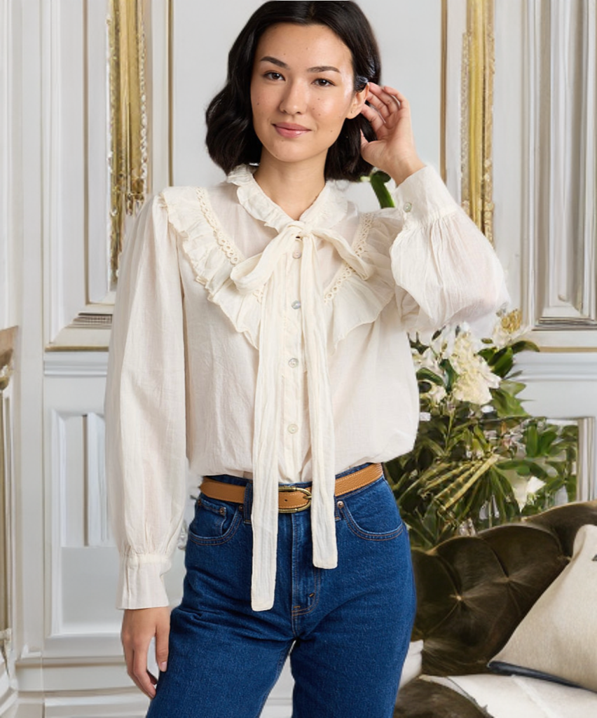 - Refined, the Gianna Blouse blends Edwardian charm with a modern, wearable silhouette. Crafted from airy Italian cotton, it features a button-front design and a softly fitted bodice that flatters without feeling too structured. A feminine tie detail at the neckline which can be tied as a bow or loosely tied for effortless drape