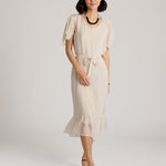 - Effortlessly refined, the Selena Dress is a mid-length silhouette crafted from a luxurious Italian silk blend. Designed to flatter with ease, it features a soft drape, elegant elbow-length sleeves, and a detachable tie belt to define the waist or wear loose for a more relaxed fit. The lightweight silk flows beautifully with every step, making it a versatile piece for day-to-night dressing.