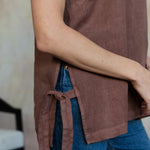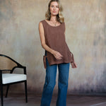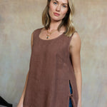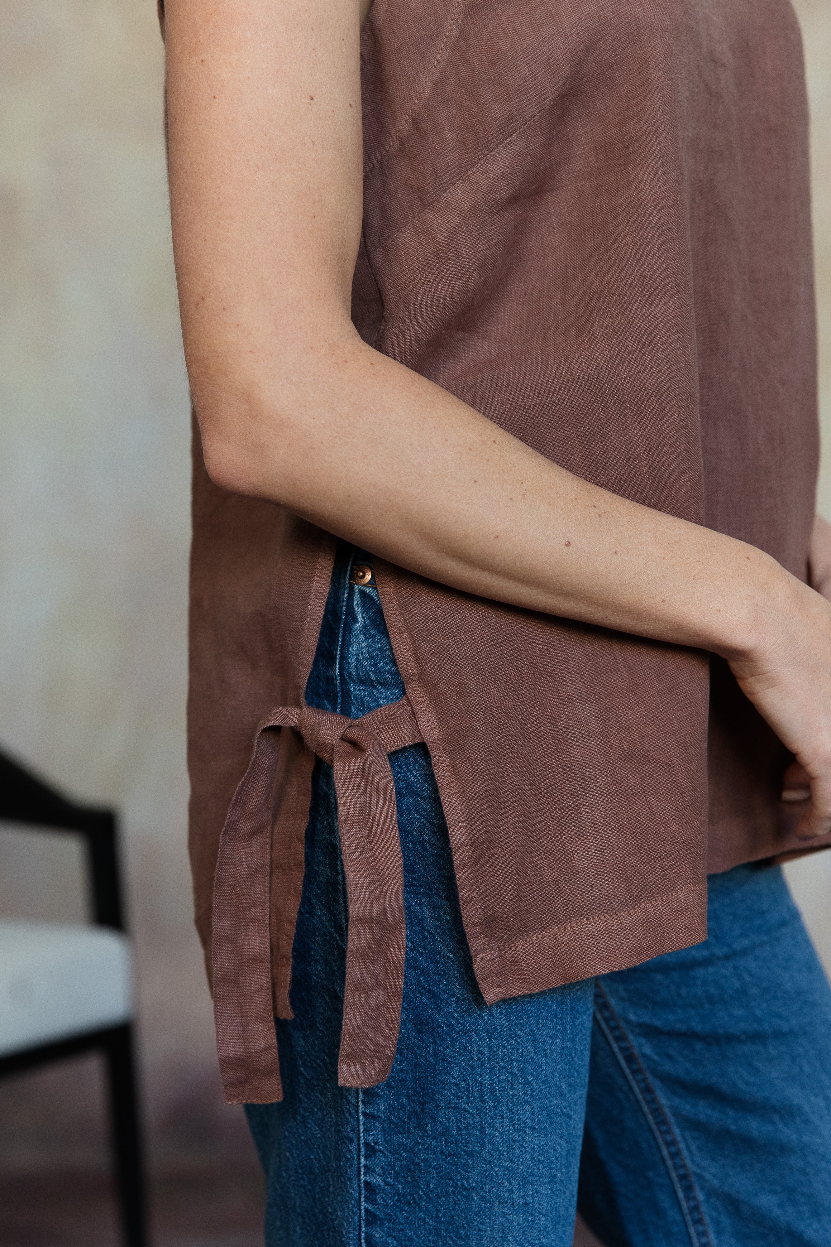 The Brina Linen Top combines breezy minimalism with thoughtful design. Its sleeveless silhouette, scoop neck, and open sides with ties offer a relaxed, adjustable fit perfect for warm days. Pair it with our Lenore Linen Pants for a chic monochromatic outfit or style it with jeans for a light and playful look. Part of our mix-and-match Italian Linen assortment.