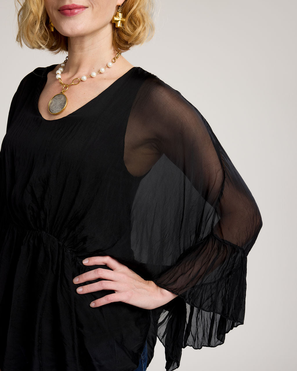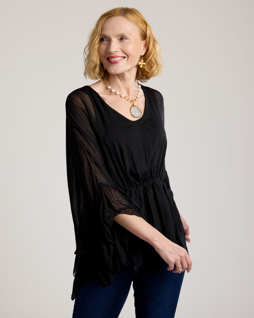 - Soft, romantic, and effortlessly flattering, the Valerie Top is crafted from an airy Italian silk blend with a delicate viscose lining for comfortable coverage. Designed with a softly cinched waist to accentuate the figure, it?s finished with cascading ruffles that add a feminine touch to every movement. Lightweight and elegant, this top pairs beautifully with everything from casual jeans to our Madelyn silk pants?perfect for both everyday sophistication and special moments.