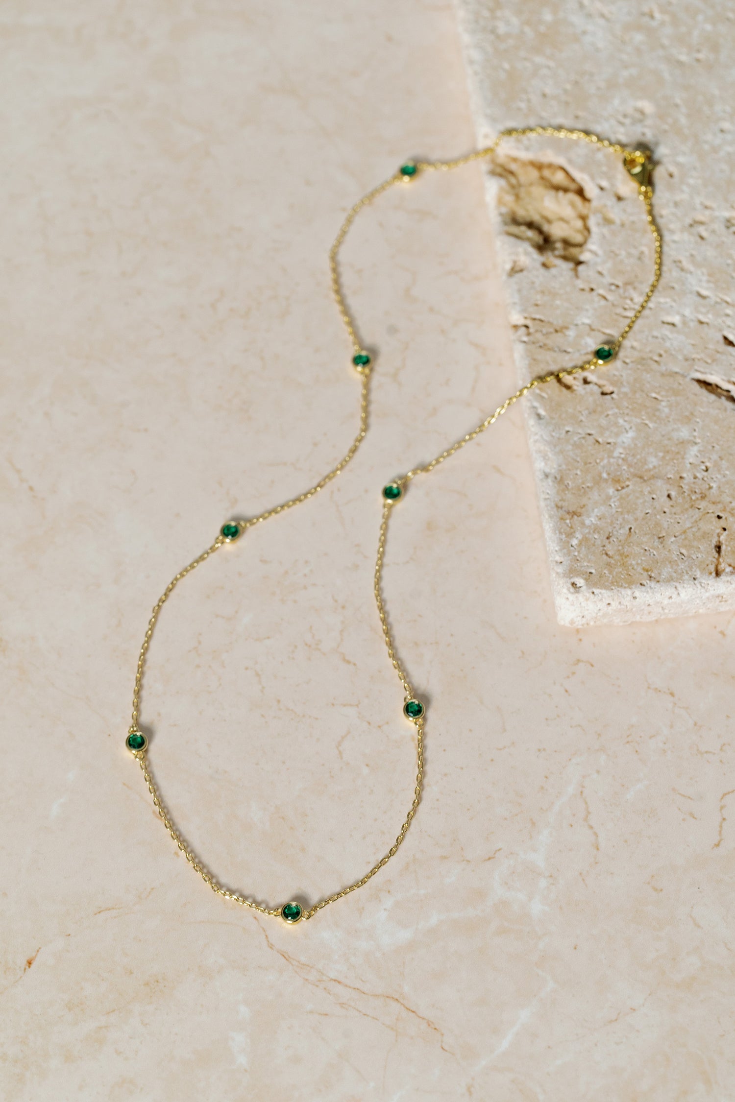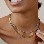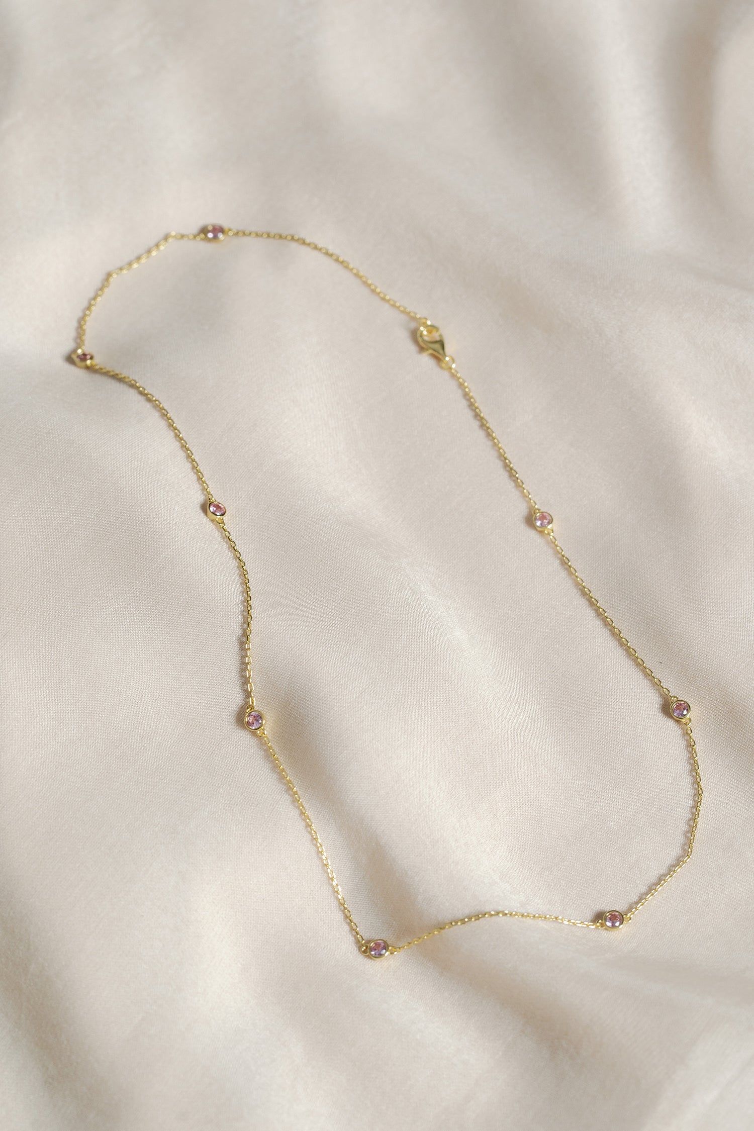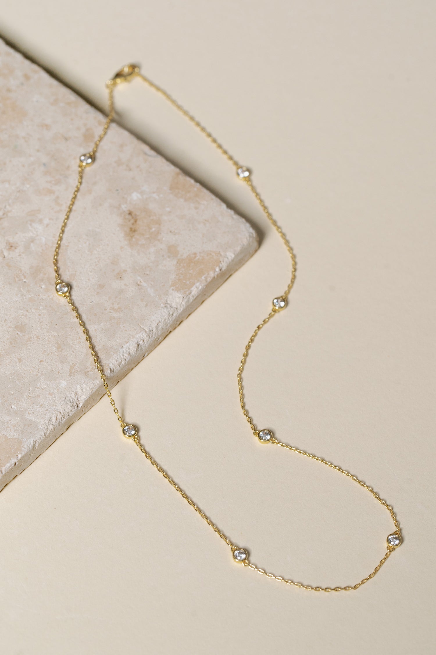 - Chain necklace with bezel-set simulated pavé stones, lobster-claw closure.
