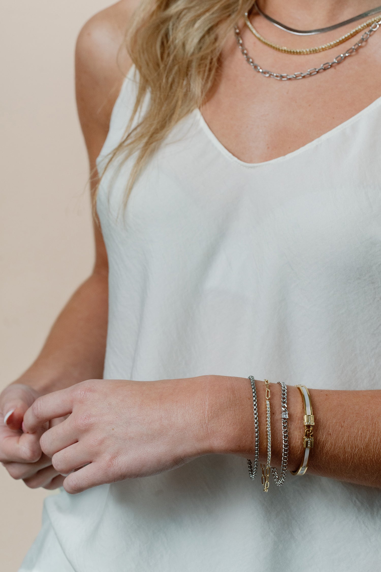 The Elizabeth Pavé Tennis Paperclip Bracelet encompasses the best of both worlds: half classic tennis bracelet, half modern paperclip chain. Dress up or down when you stack with a variety of bracelets. Part of our Stackable Jewelry assortment.