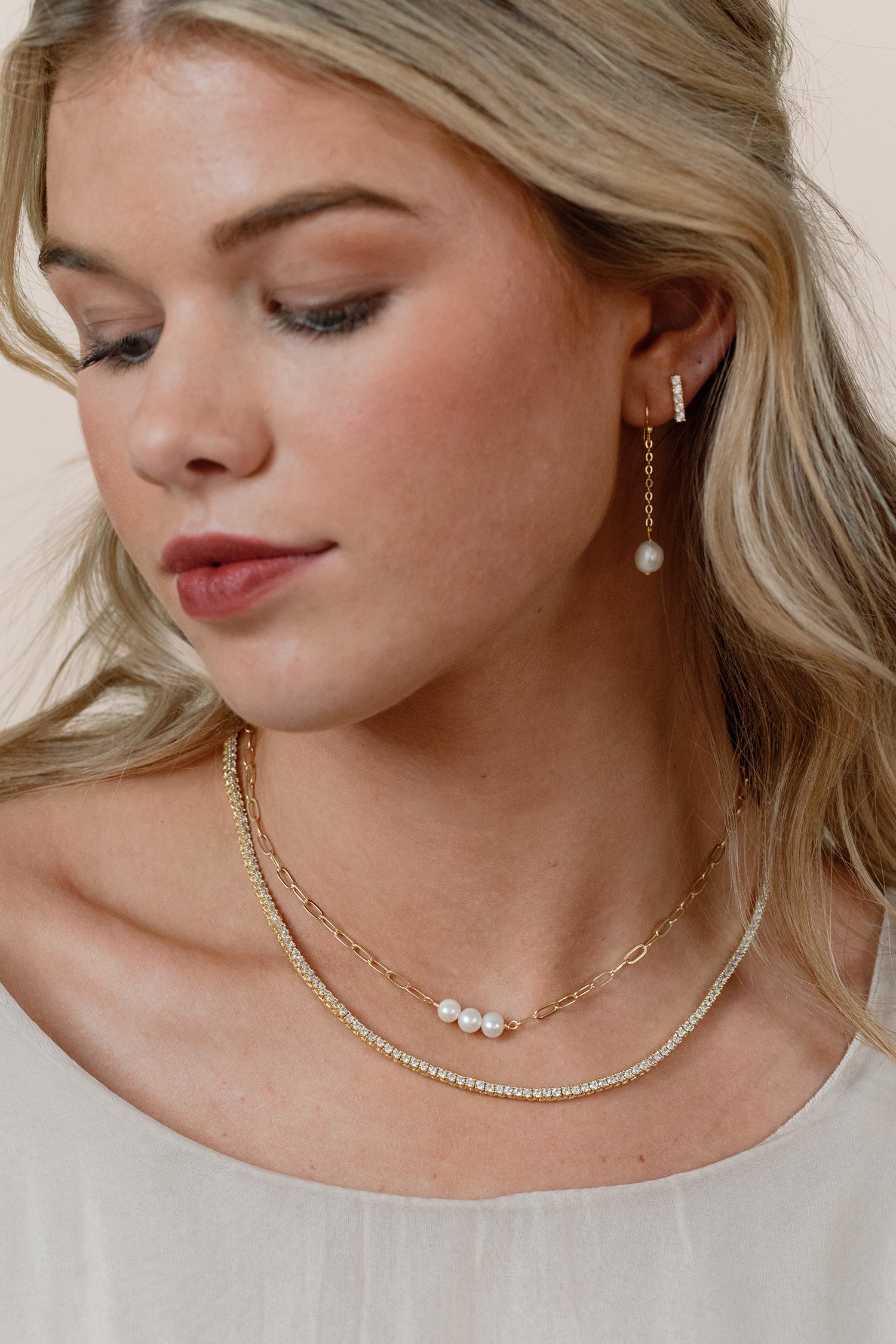 Three freshwater pearls hang at the center of a delicate chain on our Eleanor Pavé Chain Necklace, designed to stack with other pearl and pavé necklace styles. Part of our Stackable Jewelry assortment.