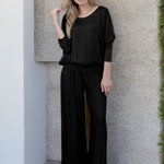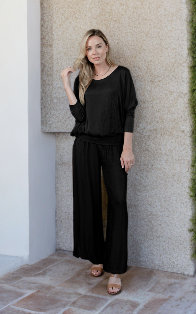 The Cassandra top drapes beautifully, offering a relaxed yet refined silhouette, while the coordinating Madelyn pants provide a tailored yet comfortable fit. Thoughtfully designed in a monochromatic palette, this set is versatile enough to dress up with heels and jewelry or keep casual with flats and a tote.
