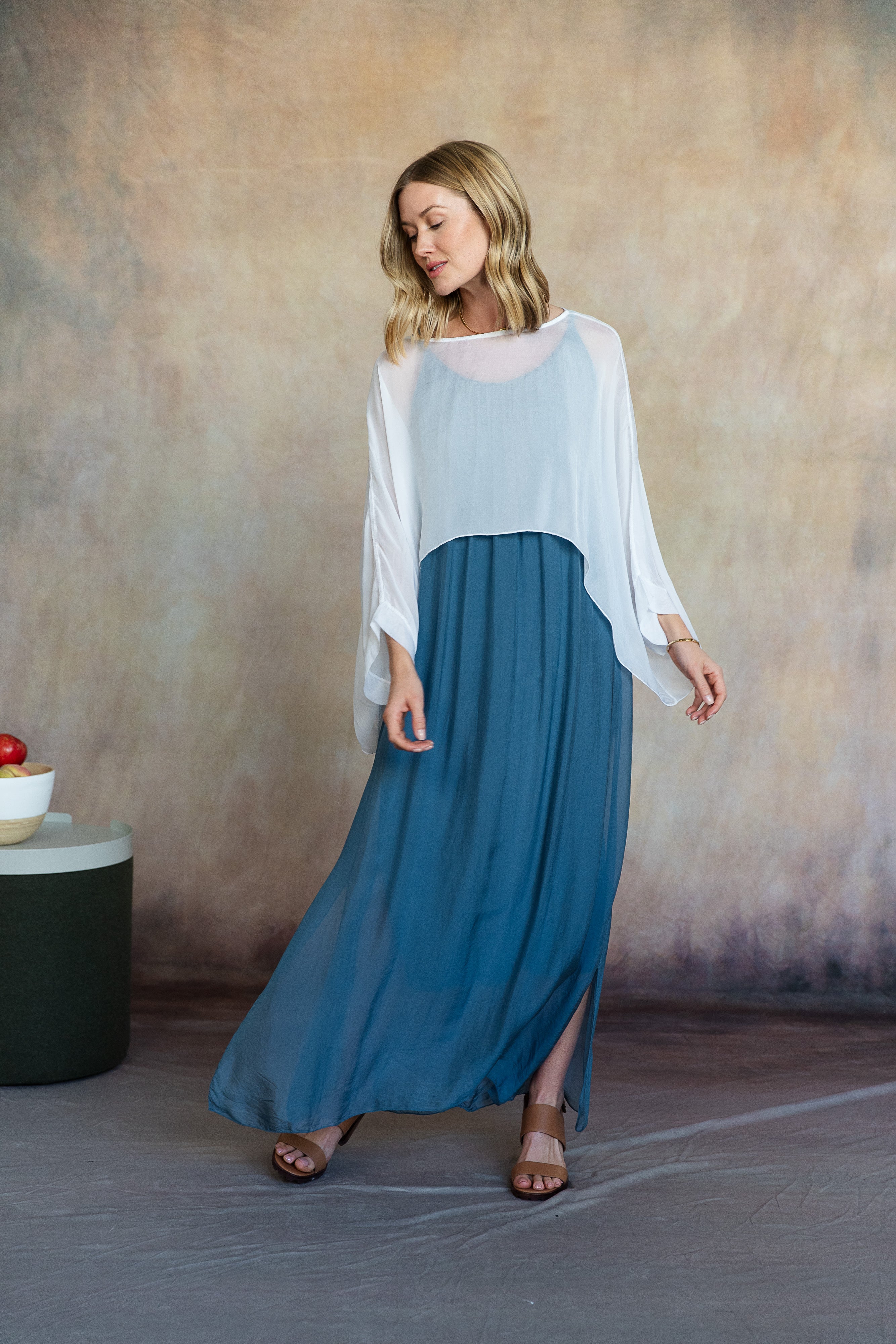 Light and versatile, the Mona Silk Topper adds a feminine touch to any outfit. Its cropped design features flowing dolman sleeves and banded bracelet-length cuffs, making it the perfect accent piece for the season. Complete your look by pairing it with the Marina Silk Dress or Madelyn Silk Pants for an ensemble that moves beautifully with you. Part of our mix-and-match Italian Silk assortment.