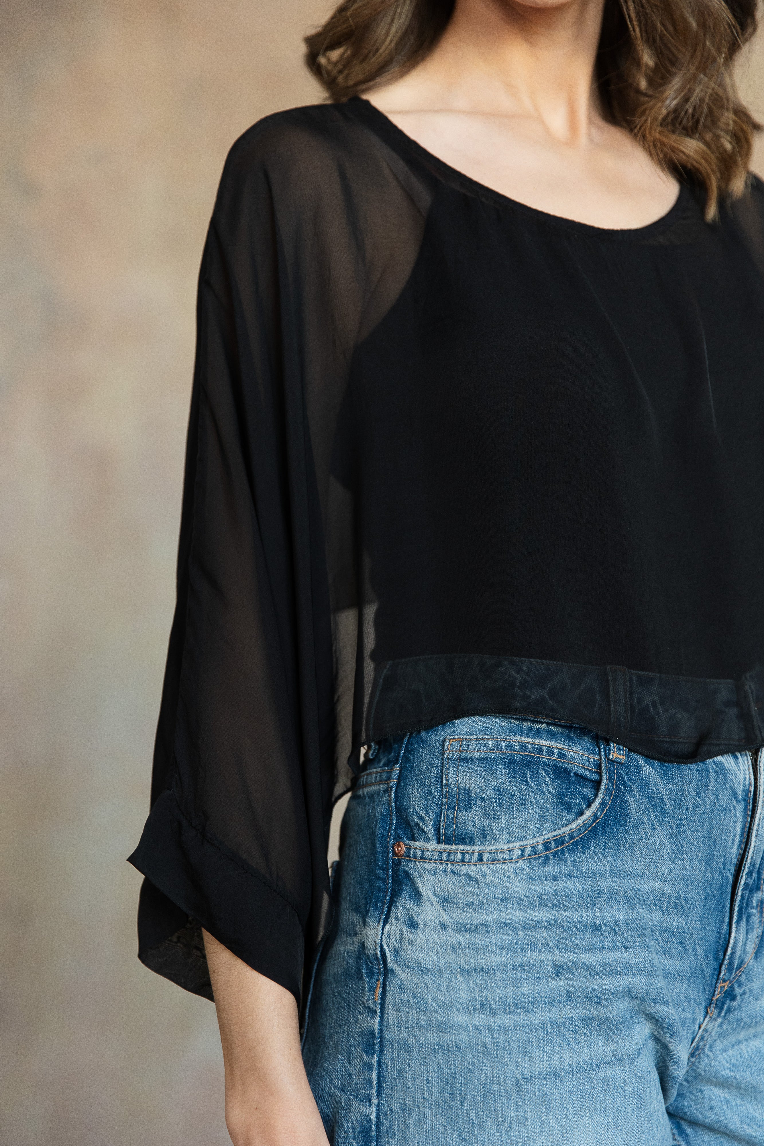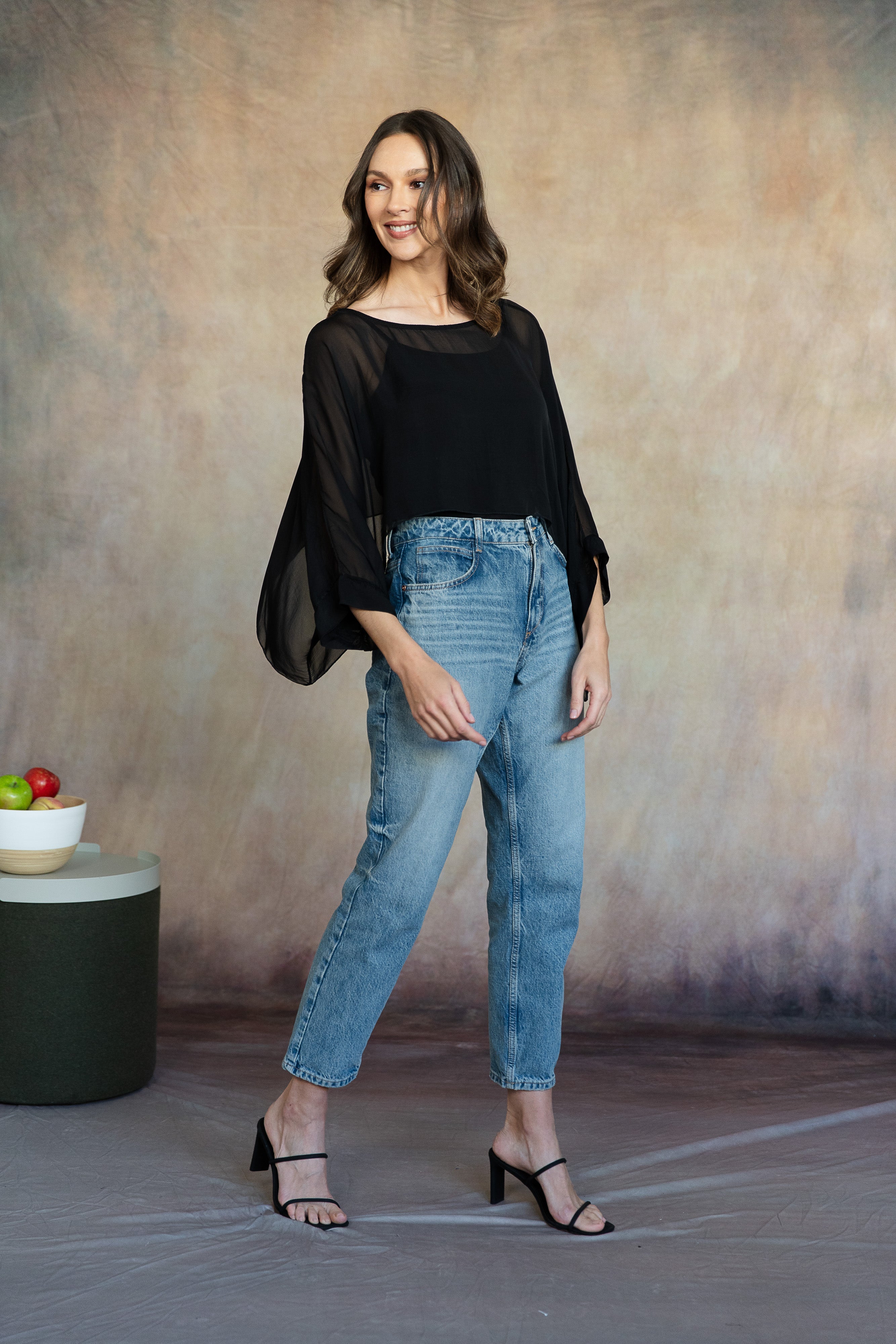 Light and versatile, the Mona Silk Topper adds a feminine touch to any outfit. Its cropped design features flowing dolman sleeves and banded bracelet-length cuffs, making it the perfect accent piece for the season. Complete your look by pairing it with the Marina Silk Dress or Madelyn Silk Pants for an ensemble that moves beautifully with you. Part of our mix-and-match Italian Silk assortment.