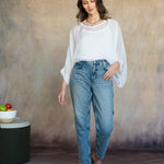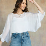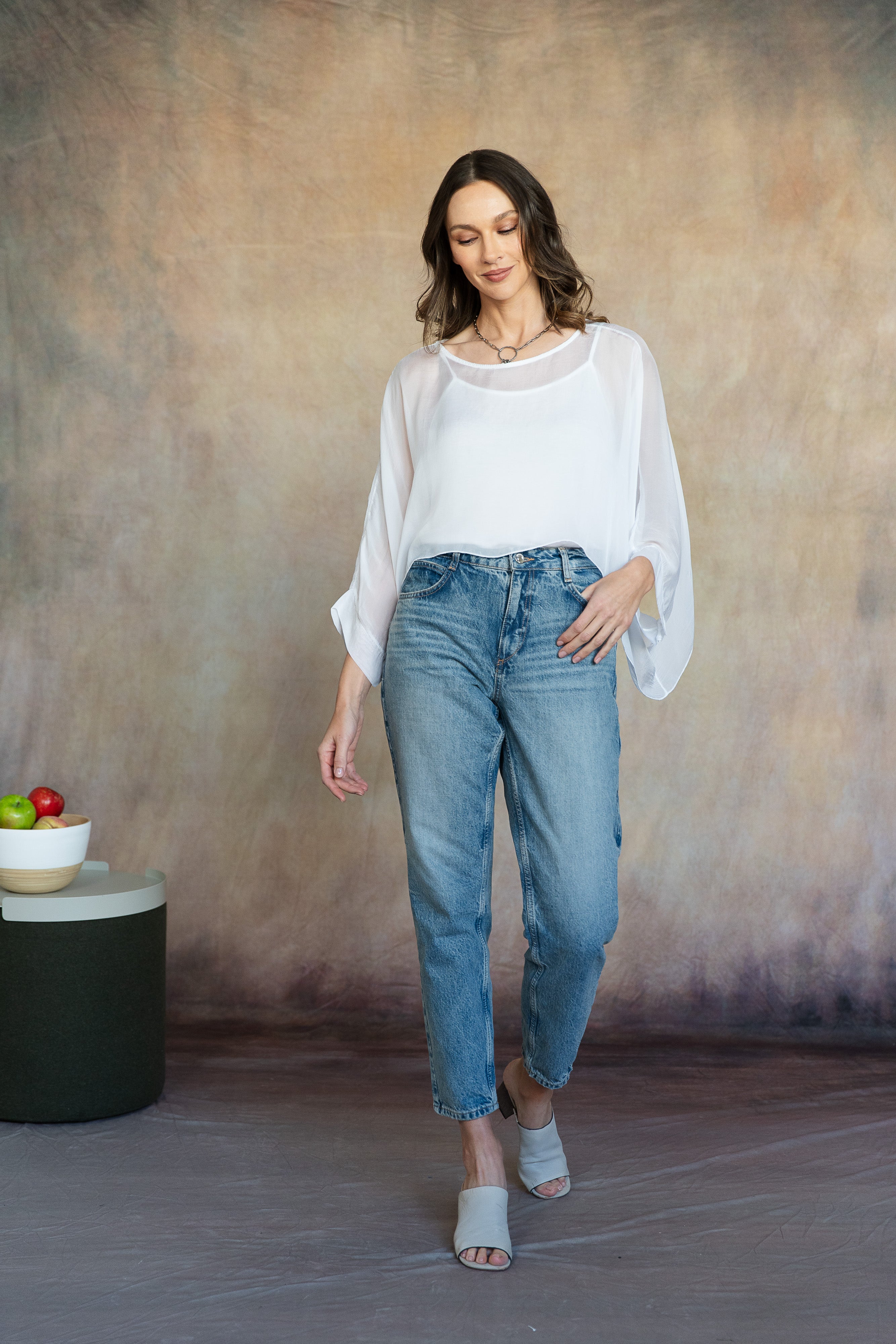 Light and versatile, the Mona Silk Topper adds a feminine touch to any outfit. Its cropped design features flowing dolman sleeves and banded bracelet-length cuffs, making it the perfect accent piece for the season. Complete your look by pairing it with the Marina Silk Dress or Madelyn Silk Pants for an ensemble that moves beautifully with you. Part of our mix-and-match Italian Silk assortment.