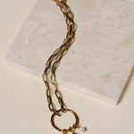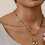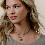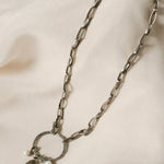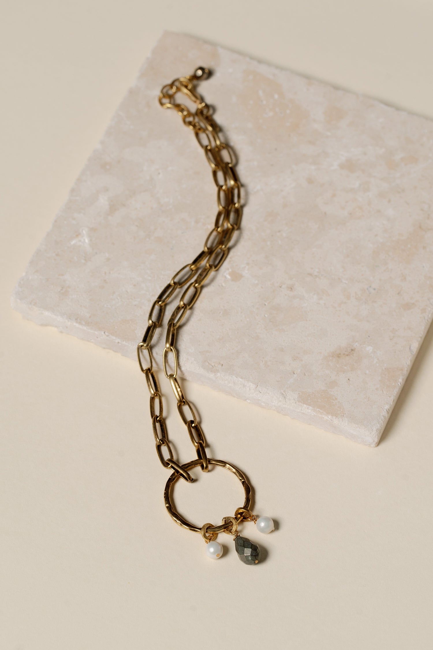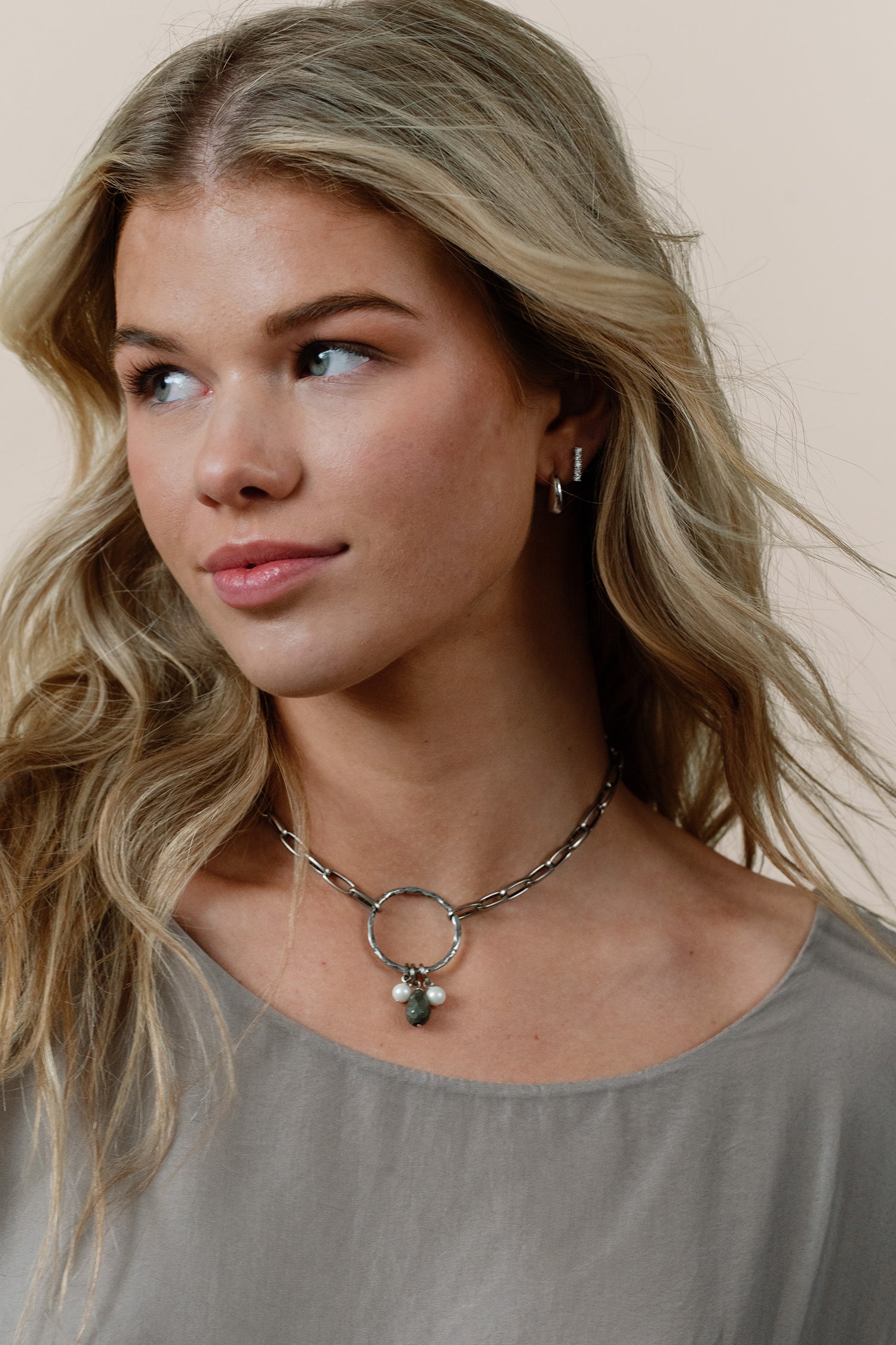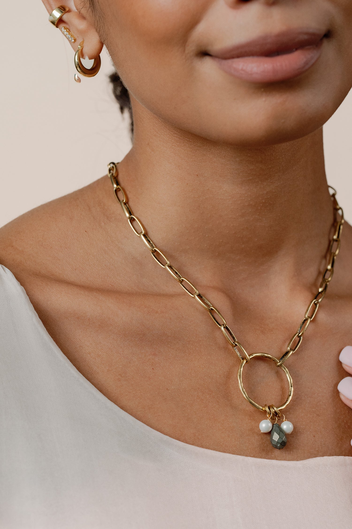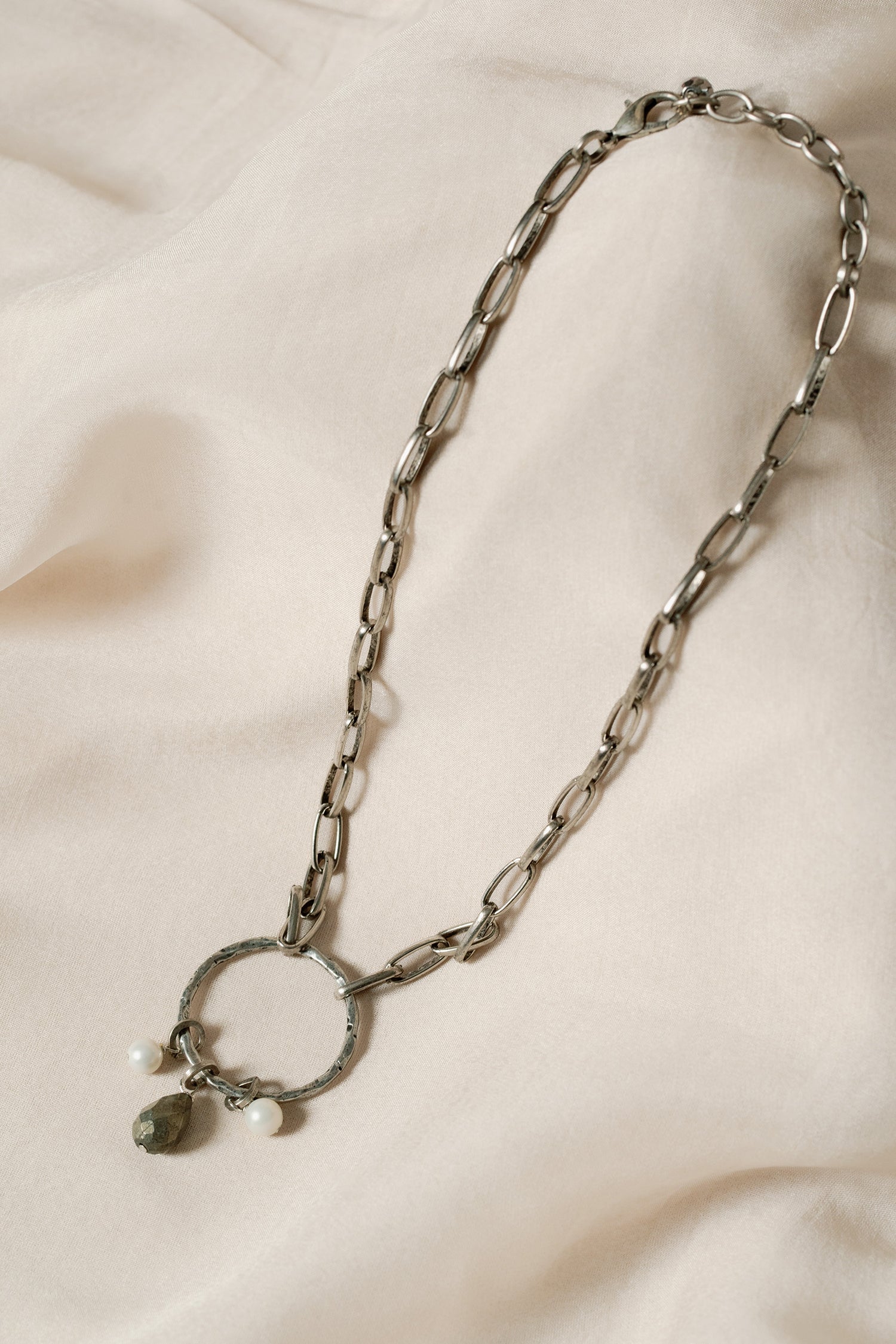 - Paperclip chain, hammered metal circle pendant with stone and pearl drop beads.