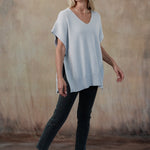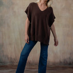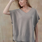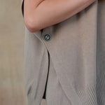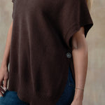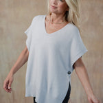 - Short sleeve, open-side sweater with mother-of-pearl button closure, ribbed hemline.